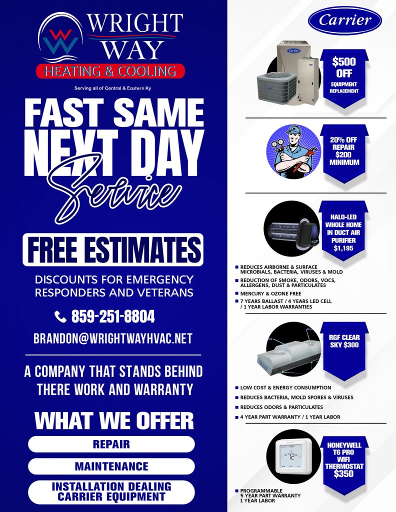 We are an expert HVAC company that offers comprehensive services to the people of Kentucky. Our team of highly skilled technicians is capable of fixing, maintaining, or upgrading any heating or cooling equipment you currently have in use. Additionally, we excel in installing new systems and can offer advice on the best energy-efficient practices and products available. Our primary objective is to ensure that all our clients enjoy comfortable indoor air throughout the year while providing fair, transparent, and professional service. Whether your HVAC needs are substantial or minor, we are fully equipped to handle them, and we’ll respond promptly to address your situation. Don’t hesitate to contact Wrightway Heating & Cooling today to discover more about our heating and cooling solutions.